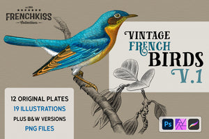 These 12 exquisite illustrations date to the late 1800s and retain their original French species titles, preserving both their artistic charm and historical authenticity. Each engraving has been meticulously scanned at twice the size of the originals, then carefully retouched and optimized over many hours to ensure crisp detail, tonal balance, and seamless usability.